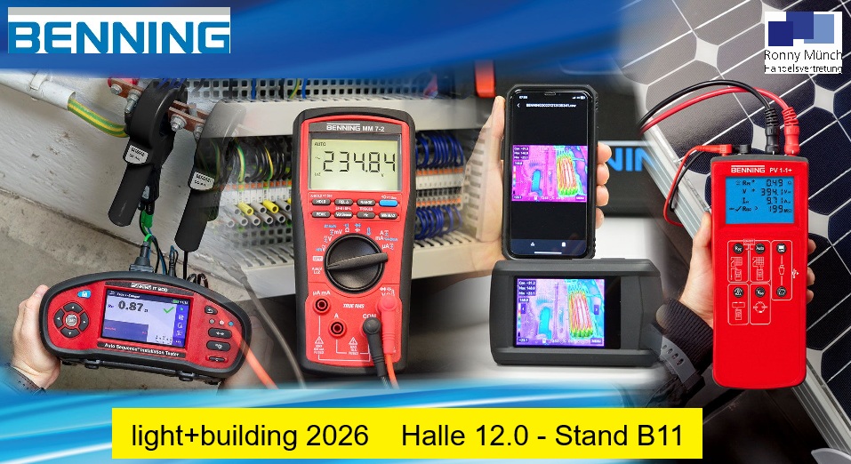 Light + Building 2026Vom 8.–13. März wird das Frankfurter Messegelände wieder zum Zentrum der Energie- und Gebäudetechnik. Wir sind bereit und freuen uns darauf, Ihnen die neuen und innovativen Produkte von Benning zu zeigen. Egal ob für die Prüfung von ortsveränderlichen Betriebsmitteln, ortsfesten Anlagen, E‑Mobility oder PV-Anlagen - wir haben für alles ein passendes Prüf- und Messgerät.